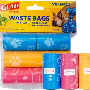 Glad for Pets Scented Waste Bags, Tear Resistant Pet Poop Pick-up Bags with Leak Protection, Lemon Scent, Multicolor Designs, 6 rolls, 90 bags total
